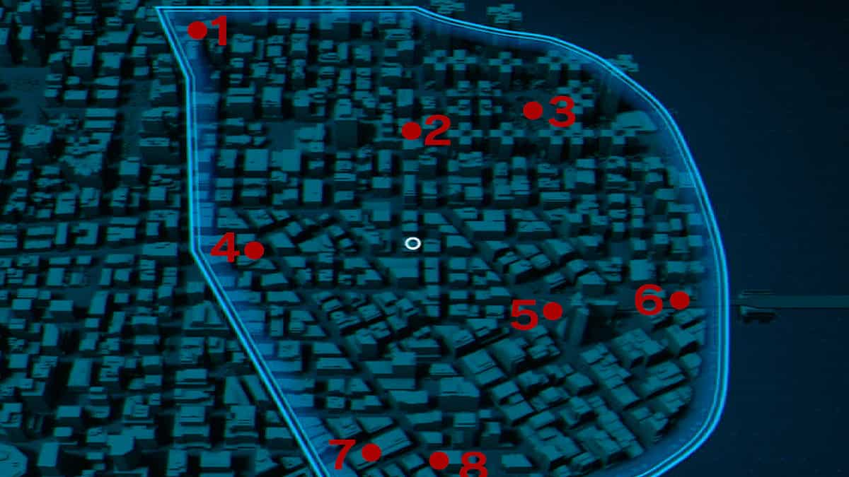 Emplacement #8 : Prenez une photo du poste de police sous un angle tel que les mots « Police » en haut soient visibles des deux côtés du bâtiment.