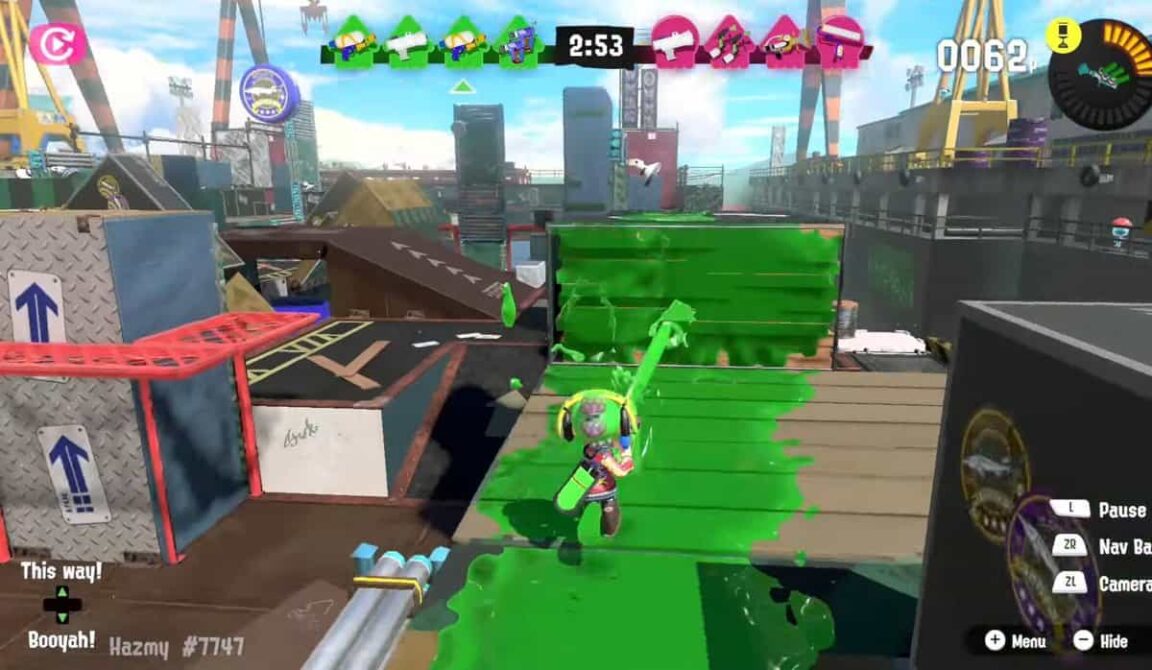 Le jet d’encre vous permet de flotter dans les airs et de tirer des projectiles sur les ennemis. Vous pouvez appuyer sur le bouton B pour commencer à flotter dans les airs et tirer sur les ennemis. Vous laisserez derrière vous une traînée d’encre qui pourra éclabousser les autres joueurs.