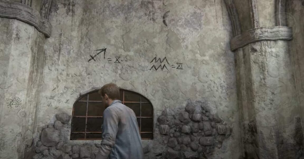 Après être entré dans la cellule de la prison par une fenêtre, vous remarquerez des symboles et des chiffres inscrits tout autour des murs.