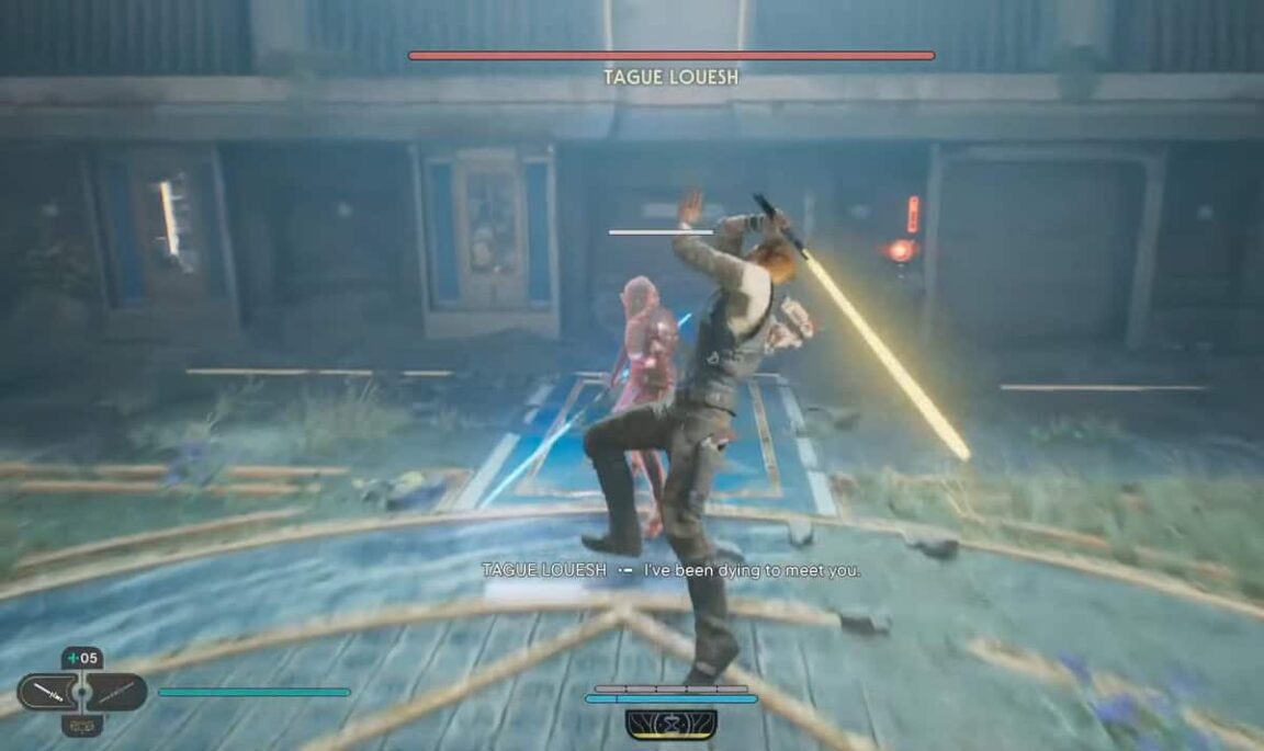 La stratégie ultime pour gagner ce combat est d’esquiver les attaques de Tague Louesh jusqu’à ce qu’il ait terminé tous ses mouvements. Il est maintenant temps de faire des contre-attaques et de baisser sa barre de santé en utilisant de puissants coups de sabre laser.