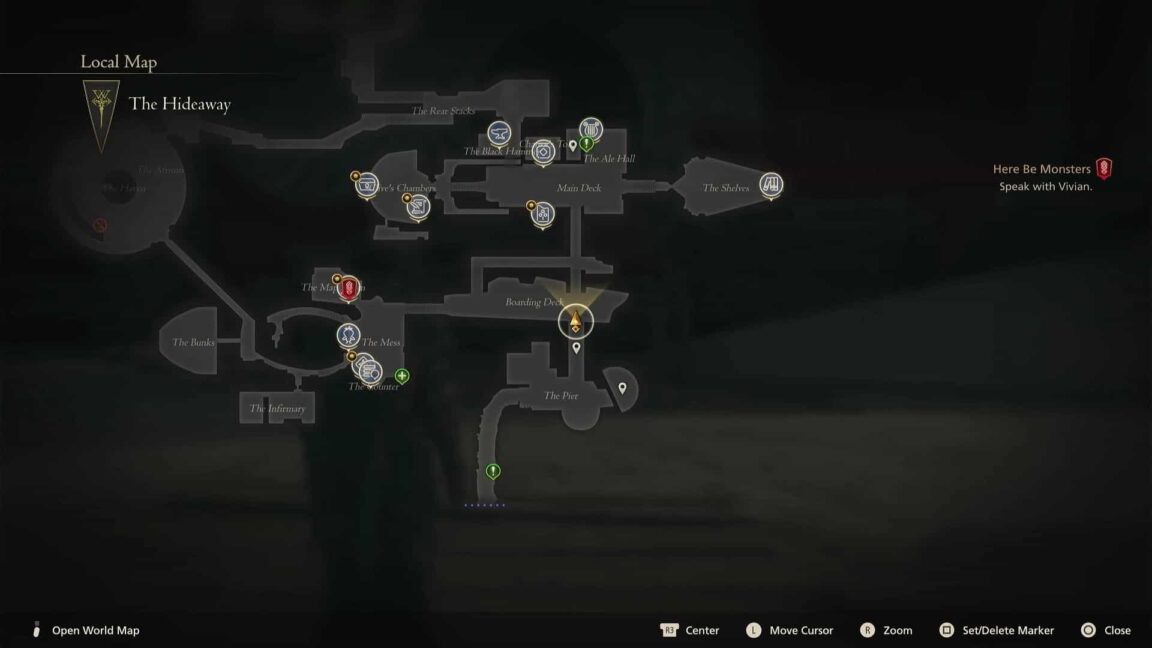 Une fois cette conversation terminée, vous ouvrirez votre carte du monde, puis sélectionnerez Drake’s Breath pour vous rendre dans la quête Here Be Monsters de Final Fantasy 16.