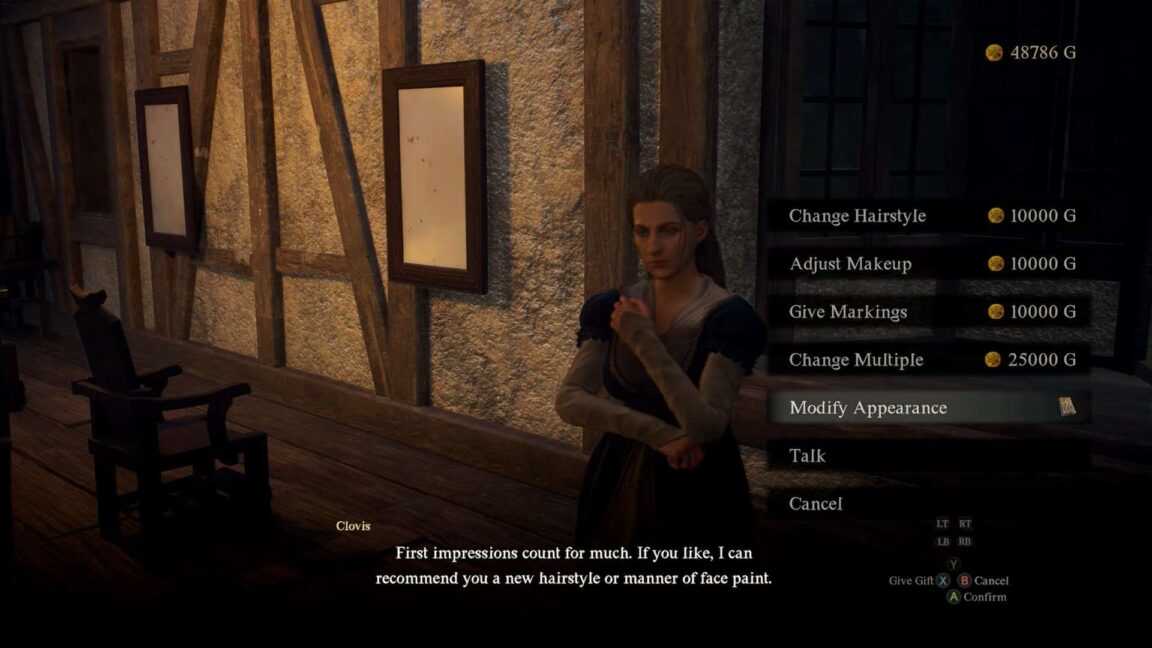Après être entré dans la boutique, vous pouvez interagir avec le PNJ pour modifier votre coiffure, votre maquillage et votre marquage. Cela vous coûtera de l’or, comme la plupart des éléments contenus dans Le dogme du dragon 2. Vous remarquerez l’option « Modifier l’apparence » dans le même menu, mais elle sera grisée.