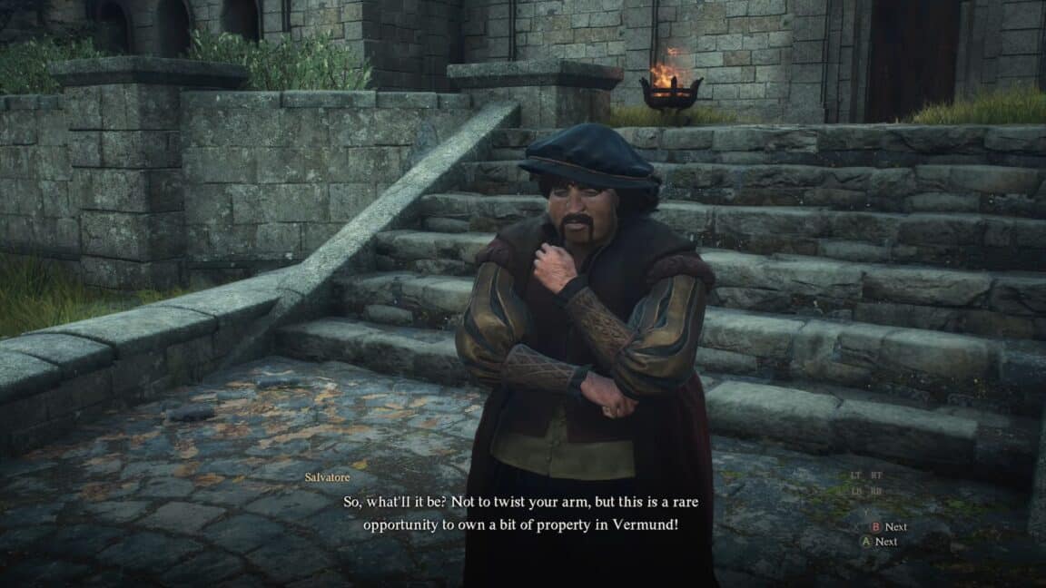 Comment acheter: Pour acheter cette demeure dans Dragon’s Dogma 2, vous devez terminer une quête secondaire intitulée «Un chez-soi». Il devient disponible une fois que vous avez terminé la quête principale « Sueur de Sovran ». Rendez-vous au Merchants Quarter et descendez l’allée du côté sud du Stardrop Inn. Ici, vous rencontrerez un PNJ nommé Mildred.