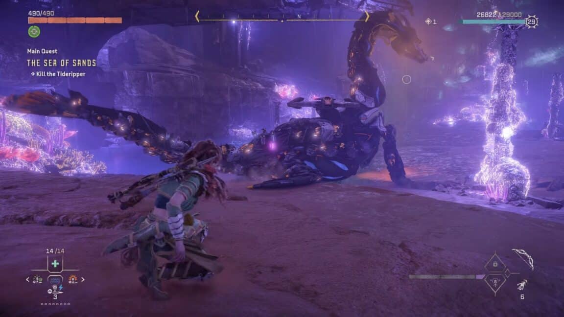 La machine a un étincelle sur le dos, et lorsque vous la ciblez avec des dégâts de choc, le Tideripper s’effondrera. Lorsqu’il est au sol, vous pouvez effectuer des attaques de finition pour l’endommager massivement. Vous pouvez également cibler la zone sous son cou, sur sa queue et son dos. Tout ce qui brille en jaune est un point faible de la machine que vous pouvez cibler en gardant une distance et répéter les attaques pour l’étaler.