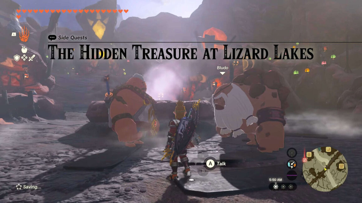 Le trésor caché des lacs Lizard ne peut être démarré à Goron City qu’après avoir terminé la quête principale de Yunobo de Goron City. Une fois que Yunobo est revenu à la normale et que vous vous êtes débarrassé de Marbled Gohma, retournez en ville avec l’aide du sanctuaire Maragukuc.