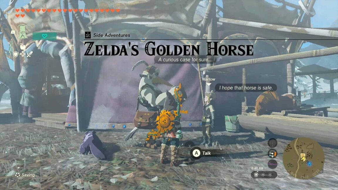 Harlow semble très affligé et vous demande de ramener le Cheval d’Or. elle pointera Nord à travers Toundra de Tabantha. Cela lancera la quête secondaire « Le cheval d’or de Zelda ».
