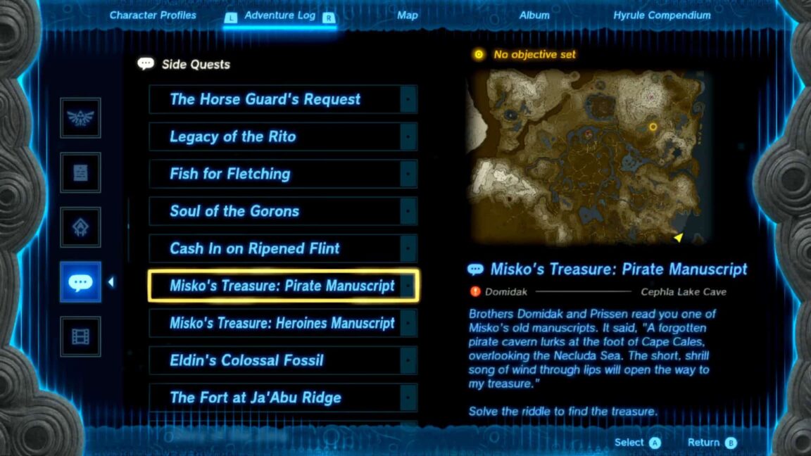 Cela complétera la quête secondaire du Trésor de Misko : Manuscrit des pirates dans Zelda : Les Larmes du Royaume.