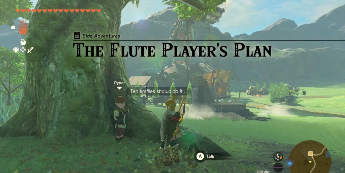 Cela déclenchera une cinématique dans laquelle Pyper joue de sa flûte pendant que toutes les lucioles illuminent l’arbre. Cela terminera le plan du joueur de flûte dans Zelda : Les Larmes du Royaume et Pyper reviendra dans son groupe pour interpréter une Sérénade pour Kaysa.