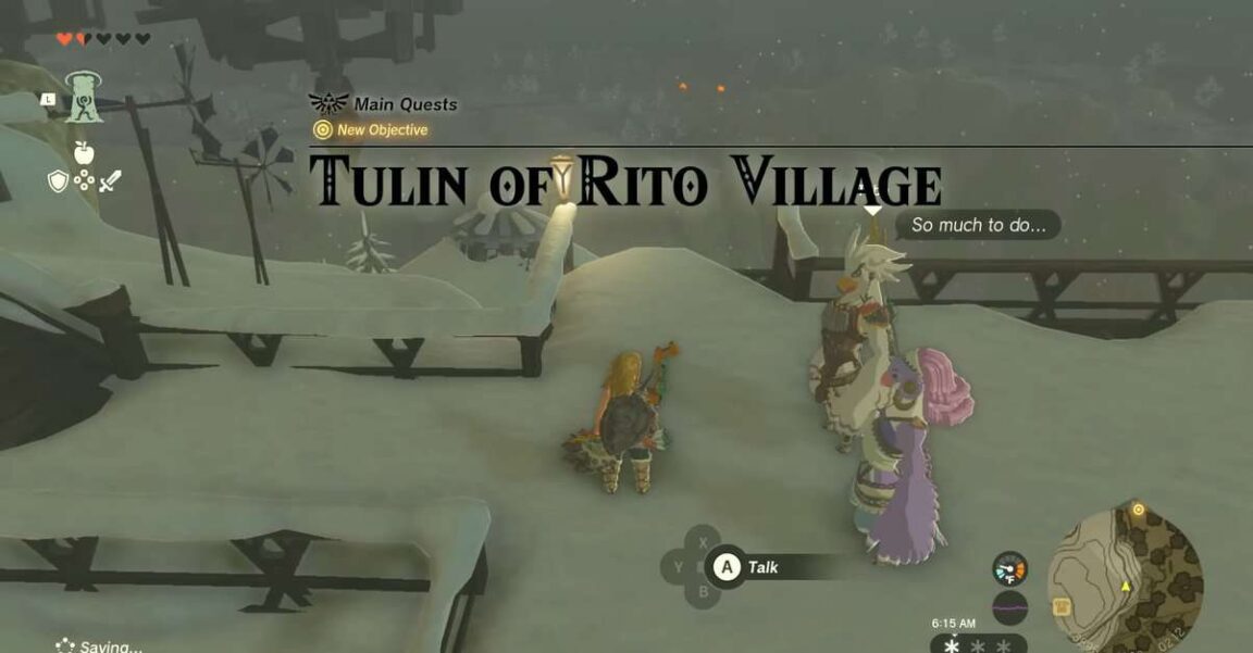 La quête commence lorsque vous parlez à l’aîné du village de Rito. À la fin de cette quête, vous obtiendrez les services de Tulin. L’aîné n’a aucune information sur la princesse Zelda, mais il pointe Harth dans un pavillon à proximité, qui pourrait le savoir. Cet endroit se trouve au pied des montagnes d’Hebra. Vous pouvez le trouver marqué par des feux de joie.