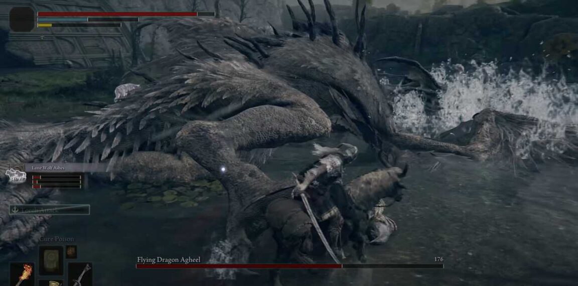 Dirigez-vous vers le sud depuis le site du tunnel de Limgrave de Grace et à l’est de l’église d’Elleh pour trouver le dragon volant Agheel. C’est le dragon le plus facile et le premier que vous rencontrerez dans Anneau ancien. Le combat sera délicat et vous devez être au moins au niveau 25 pour le mener.