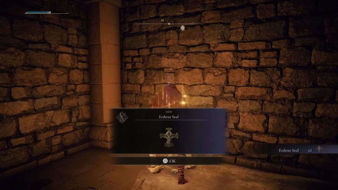 C’est la première porte à droite dans le couloir ouest. Frappez le mur illusoire près d’un cadavre avec une bouteille de parfum pour débloquer le chemin caché. Suivez ce chemin pour atteindre le site de grâce de l’église de Prison Town. Dirigez-vous vers l’ouest et sautez pour rencontrer un Tueur de présages près d’un feu de joie. Tuez-le et entrez dans la cellule ouverte pour récupérer le sceau d’Erdtree sur un cadavre.