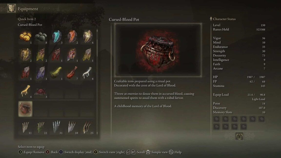 Il y a 10 pots rituels disponibles dans le jeu de base. Le moyen le plus simple d’obtenir un pot rituel vide est de l’acheter auprès de Pidia, la servante carienne du Manoir Caria. Vous pouvez également en récupérer un à l’Académie Raya Lucaria (près du site Schoolhouse Classroom de Grace) et deux à Jarburg.