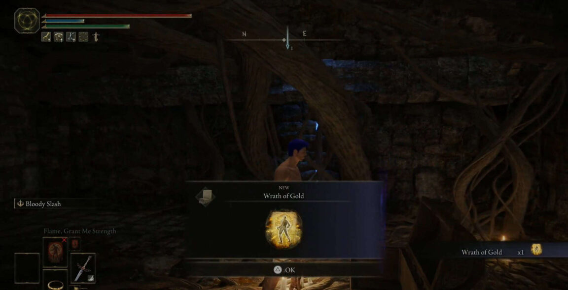 Voyagez vers le nord-est jusqu’à ce que vous rencontriez les ruines avec trois ennemis au visage de ver. Il y a une entrée juste à côté qui mène à une petite cave. Entrez dans la cave et ouvrez le coffre au trésor pour obtenir l’incantation Wrath of Gold dans Elden Ring.