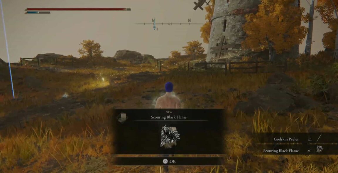 Une fois vaincu, l’apôtre Godskin de Dominula, Windmill Village, lâche l’incantation Scouring Black Flame dans Elden Ring.